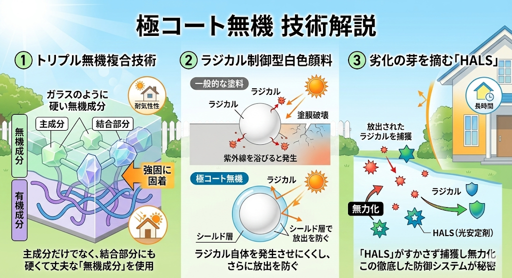 極コート無機は、このラジカル自体を発生させにくくし、さらにシールド層で外部への放出を防ぐ特殊な顔料を採用しています。